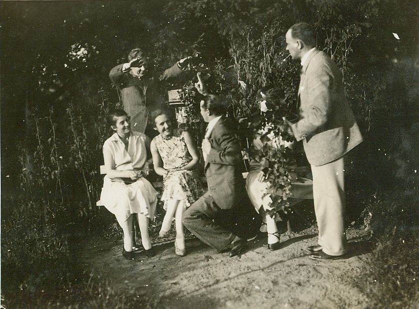 | Nr. inwentarzowy: MŁJ-XVI 1745 / 00 / 011 opis: Sześć osób na i przy ławce w parku?, ogrodzie? Mężczyźni w garniturach, kobiety w letnich sukienkach. Za ławką stoi mężczyzna NN (z wyciągniętymi rękami), na ławce siedzą: kobieta NN, Anna Leska, Nina Michalewska (słabo widoczna). Klęczy Kazimierz Ważyński, stoi z boku Władysław Lenczewski.data: lipiecczas powstania - daty graniczne: 1931-07-01 - 1931-07-31miejsce: Rury (obecnie dzielnica Lublina), tor wyścigów konnych.osoby: Anna (Anka) Leska, później Leska-Daab (1910-1998), por. Kazimierz Ważyński 3 DAK, Nina Michalewska, Władysław Lenczewski, aktor (1882-1945. tworzywo: papier fotograficzny, błyszczącytechnika: odbitka żelatynowo-srebrowa DOP, czarno-białazespół: album rodziny Leskichwymiary (wys. x szer.): 84 x 112 [mm]