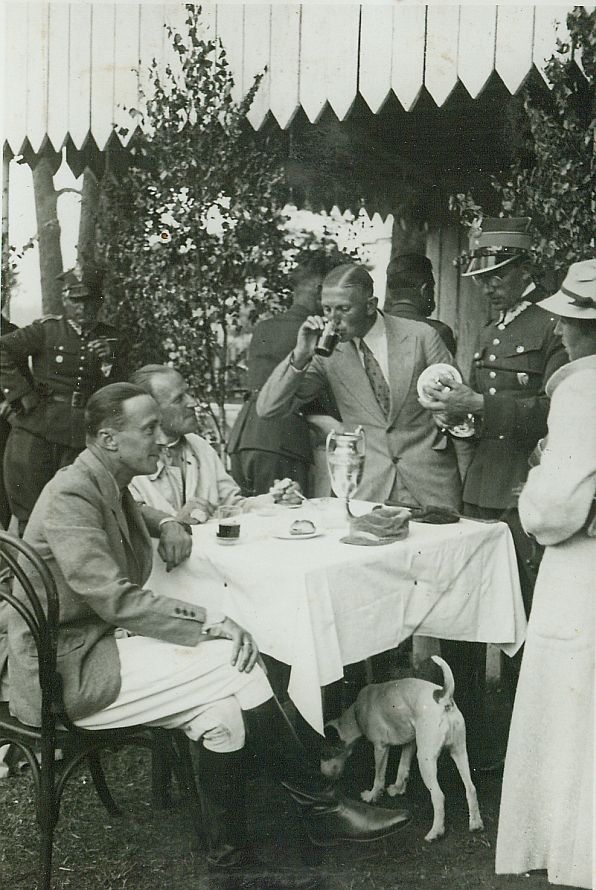 | Nr. inwentarzowy: MŁJ-XVI 1746 / 00 / 053 opis: Tor wyścigów konnych, po wyścigach. Przed drewnianym gankiem stół przykryty jasnym obrusem, na nim m.in. puchar - nagroda. Od lewej: siedzi T. Rybicki w cywilnym stroju jeździeckim, siedzi Władysław Bobiński w jasnej kurtce, stoi i popija wino z lodem Michał Bohdanowicz w garniturze, stoi i ogląda puchar Andrzej Szamota w mundurze, stoi w jasnym płaszczu i kapeluszu Wanda Bohdanowicz. Pod stołem pies Kimi.czas powstania - daty graniczne: 1936-06-28 - 1936-07-09miejsce: Wilno, Pośpieszka.osoby: Por. Tadeusz Rybicki „Rybka” (1901-1997), 4 p.u. Rtm. Michał Bohdanowicz "Miś" (1903-1948), 13 p.u., dowódca 1 szwadronu "Tatarskiego". Rtm. Władysław Bobiński (1901-1975 Londyn), 15 p.u. Ppor. Andrzej Szamota, 13 p.u. Wanda Bohdanowicz zd. Leska (1908-1991).tworzywo: papier fotograficzny, błyszczącytechnika: odbitka żelatynowo-srebrowa DOP, czarno-białazespół: album rodziny Leskichwymiary (wys. x szer.): 130 x 87 [mm]