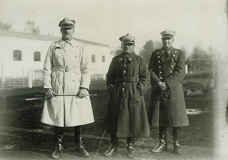 | Nr. inwentarzowy: MŁJ-XVI 1745 / 00 / 043 opis: Na placu przed budynkiem (stajnią?) stoi trzech oficerów, od lewej: Stefan Skarżyński, Stefan Liszko, Władysław Domiszewski. Wszyscy w rotatywkach, S.Skarżyński w jasnym płaszczu z palcatem, dwaj pozostali w płaszczach mundurowych.czas powstania - daty graniczne: 1931-11-03 - 1931-11-03miejsce: Stanisławówosoby: Mjr Stefan Skarżyński (1893-1962, brat stryjeczny Kazimierza Skarżyńskiego, kwatermistrz 9 p.s.k.), ppłk Stefan Juliusz Marian Liszko (1892-1991, od 28.01.1931 r. dowódca 6 p.u.), por. Władysław Domiszewski 6 p.u.inne nazwy własne: bieg św. Hubertatworzywo: papier fotograficzny, błyszczącytechnika: odbitka żelatynowo-srebrowa DOP, czarno-białazespół: album rodziny Leskichwymiary (wys. x szer.): 78 x 110 [mm]