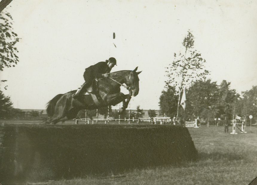 | Nr. inwentarzowy: MŁJ-XVI 1629 / 00 / 013 opis: Konkurs skoków przez przeszkody - Barbara Grotthus w ciemnym stroju skacze na koniu Ariel ciemnej maści przez żywopłot przystrzyżony w formie pryzmy. W głębi inne przeszkody, żołnierz, drzewa.czas powstania - daty graniczne: 1938-03-01 - 1938-10-30miejsce: Hrubieszówosoby: Barbara Grotthus (1917-1999), córka Gustawa i Anny zd. Chłapowskiejtworzywo: papier fotograficzny, błyszczącytechnika: odbitka żelatynowo-srebrowa DOP, czarno-białazespół: album rodziny Grotthuswymiary (wys. x szer.): 66 x 86 [mm] Koń: 1. Ariel