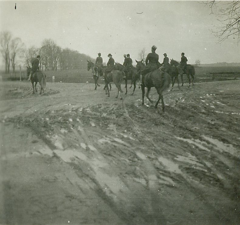| Nr. inwentarzowy: MŁJ-XVI 1744 / 00 / 009 opis: Bieg św. Huberta urządzony przez pp. Skarżyńskich. Ośmioro jeźdźców na koniach jedzie na start biegu. Ujęcie z tyłu. Grupa jeźdźców w strojach jeździeckich i mundurach po podjechaniu pod skarpę zmierza drogą na start. Jeden cywil wysunięty do przodu - master? Ostatni oficer. W oddali szpaler drzew.czas powstania - daty graniczne: 1930-11-09 - 1930-11-09miejsce: Warszawa, Wilanów?tworzywo: papier fotograficzny, błyszczącytechnika: odbitka żelatynowo-srebrowa DOP, czarno-białazespół: album rodziny Leskichwymiary (wys. x szer.): 60 x 64 [mm]