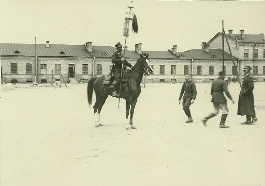 | Nr. inwentarzowy: MŁJ-XVI 1747 / 00 / 040 opis: Duży plac z parterowymi i piętrowymi budynkami - koszary? Żołnierze 1 Szwadronu Tatarskiego - jeden konno z buńczukiem ofiarowanym przez Tatarów wileńskich w 1937 roku i buńczukiem przechodnim Wileńskiej BK (wcześniej 3 SBK). który w kwietniu 1934 roku przeszedł na polecenie marszałka J. Piłsudskiego na własność 1 szwadronu 13 p.u. jako nagroda za wzorową postawę na defiladzie z okazji 15 rocznicy wyzwolenia Wilna. Z prawej trzech wojskowych, w tym rtm. Michał Bohdanowicz (w płaszczu).czas powstania - daty graniczne: 1938-05-01 - 1938-05-31miejsce: Nowa Wilejka - lewobrzeżna dzielnica Wilna, do 1957 samodzielne miasto; w okresie II RP w Nowej Wilejce stacjonował 13 p.u.osoby: Rtm. Michał Bohdanowicz (1903-1948). Syn Jana Bohdanowicza i Marii z Cywińskich. W latach 1932-1936 i przed II wojną służył w 4 Pułku Ułanów Zaniemeńskich, od 1936 w 13 Pułku Ułanów Wileńskich, jako dowódca 1 szwadronu "Tatarskiego" (do 15.05.1938).inne nazwy własne: Nowo-Wilejka, Nowa-Wilejkatworzywo: papier fotograficzny, błyszczącytechnika: odbitka żelatynowo-srebrowa DOP, czarno-białazespół: album rodziny Leskichwymiary (wys. x szer.): 57 x 81 [mm]
