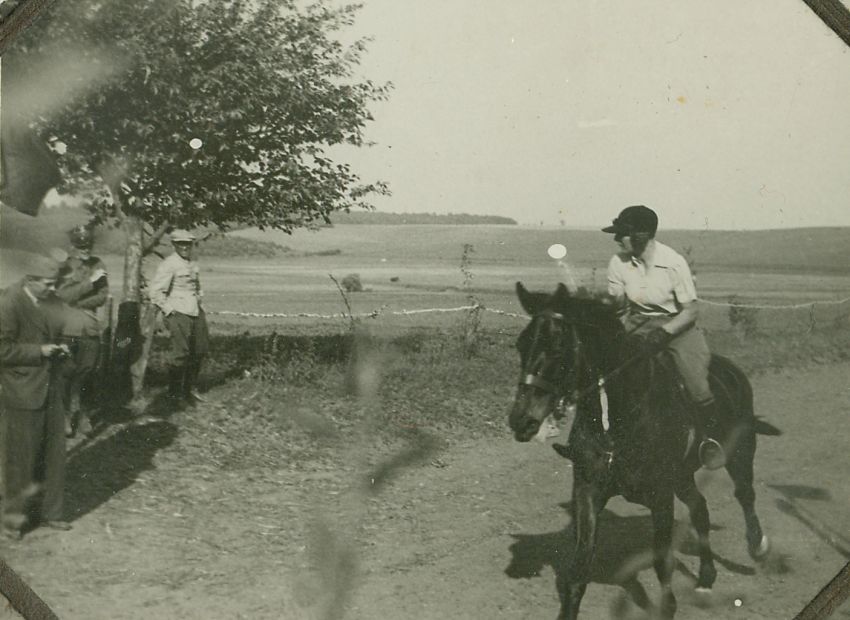 | Nr. inwentarzowy: MŁJ-XVI 1629 / 00 / 034 opis: Rajd konny Hrubieszów-Trzeszczany - droga wśród łąk i pól, drzewko. Na koniu ciemnej maści galopuje Jadwiga Grotthus. Pod drzewkiem stoi mężczyzna w stroju roboczym, żołnierz i cywil w garniturze i furażerce.czas powstania - daty graniczne: 1936-05-15 - 1936-05-31miejsce: trasa Hrubieszów-Trzeszczanyosoby: Jadwiga Grotthus (1920-2011), córka Gustawa i Anny zd. Chłapowskiejtworzywo: papier fotograficzny, błyszczącytechnika: odbitka żelatynowo-srebrowa DOP, czarno-białazespół: album rodziny Grotthuswymiary (wys. x szer.): 61 x 82 [mm]