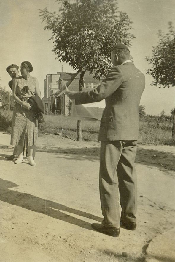 | Nr. inwentarzowy: MŁJ-XVI 1640 / 00 / 043 opis: Rajd Poznań-Gdynia, zorganizowany przez Śląski Klub Jazdy Konnej. Gdynia, droga, w głębi drzewka, domy. Tyłem stoi mężczyzna w garniturze i berecie z rozłożoną gazetą (St. Grabianowski?). Naprzeciwko K. Dobrogoyska w sukience i berecie, za nią drugi mężczyzna w berecie.data: podano początkową i końcową datę rajduczas powstania - daty graniczne: 1933-08-03 - 1933-08-28miejsce: Gdyniaosoby: Krystyna Dobrogoyska (1902-1975), prawdopodobnie inż. Stanisław Grabianowski (1889-1957, szef wyprawy)tworzywo: papier fotograficzny, błyszczącytechnika: odbitka żelatynowo-srebrowa DOP, czarno-białazespół: album rodziny Brökerewymiary (wys. x szer.): 91 x 64 [mm]