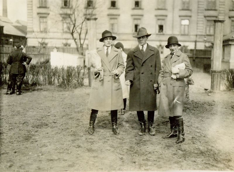 | Nr. inwentarzowy: MŁJ-XVI 1753 / 00 / 111 opis: Na placu stoją jeźdźcy trenujący na ujeżdżalni Wyższej Szkoły Wojennej. Od lewej: Paulina Jaroszewiczowa, rtm. Wilhelm Lewicki, Laura Dobruttowa. Wszyscy w kapeluszach i płaszczach na strojach jeździeckich. Z tyłu inne osoby, w tle ogrodzenia, zabudowania.data: kwiecień 1930 r.czas powstania - daty graniczne: 1930-04-01 - 1930-04-30miejsce: Warszawa, ul. Koszykowa 79, Wyższa Szkoła Wojenna, ujeżdżalnia położona w kwartale: Koszykowa – Krzywickiego/Sucha – 6 Sierpnia/Nowowiejska – Topolowa/Al. Niepodległościosoby: Paulina Jaroszewiczowa ("Lusia", startowała m.in. na koniach Dukat i Barnaba, także podczas warszawskich zawodów w Łazienkach, w skokach i ujeżdżeniu); rtm. Wilhelm Rogala-Lewicki 1898-1992; Laura Dobruttowa 1896-1988 (z domu Weychert, jeździła na nartach i konno, w barwach Klubu Sportowego Rodziny Wojskowej wielokrotnie startowała w konkursach hipicznych, także w międzynarodowych w Warszawie).inne nazwy własne: W.S.W - WSW - W.S.Woj. - Wyższa Szkoła Wojennatworzywo: papier fotograficzny, błyszczącytechnika: odbitka żelatynowo-srebrowa DOP, czarno-białazespół: album rodziny Bohdanowiczówwymiary (wys. x szer.): 85 x 114 [mm]