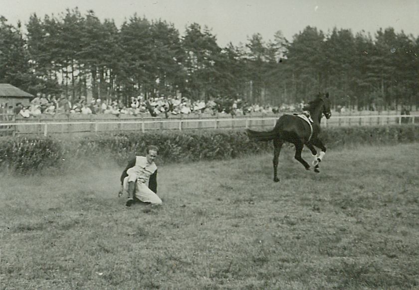 | Nr. inwentarzowy: MŁJ-XVI 1746 / 00 / 090 opis: Tor wyścigów konnych, Steeple-chase, upadek. Andrzej Szamota podnosi się z bieżni. Koń Herring galopuje dalej. Jeździec w stroju wyścigowym (białe bryczesy, jasna kurtka z ciemnymi rękawami, brak czapki). W tle żywopłot, zewnętrzna bariera, mały domek, ogrodzenie, publiczność, drzewa.czas powstania - daty graniczne: 1936-07-16 - 1936-07-16miejsce: Wilno, Pośpieszka.osoby: Ppor. Andrzej Szamota h. Prawdzic 13 p.u., 1939 awans na porucznika, poległ 24 września 1939 pod Suchowolą.tworzywo: papier fotograficzny, błyszczącytechnika: odbitka żelatynowo-srebrowa DOP, czarno-białazespół: album rodziny Leskichwymiary (wys. x szer.): 60 x 84 [mm] Koń: 1. Herring - koń, który startował pod rtm. Nestorowiczem w biegach na przełaj, a pod A. Szamotą w steeple-chase.