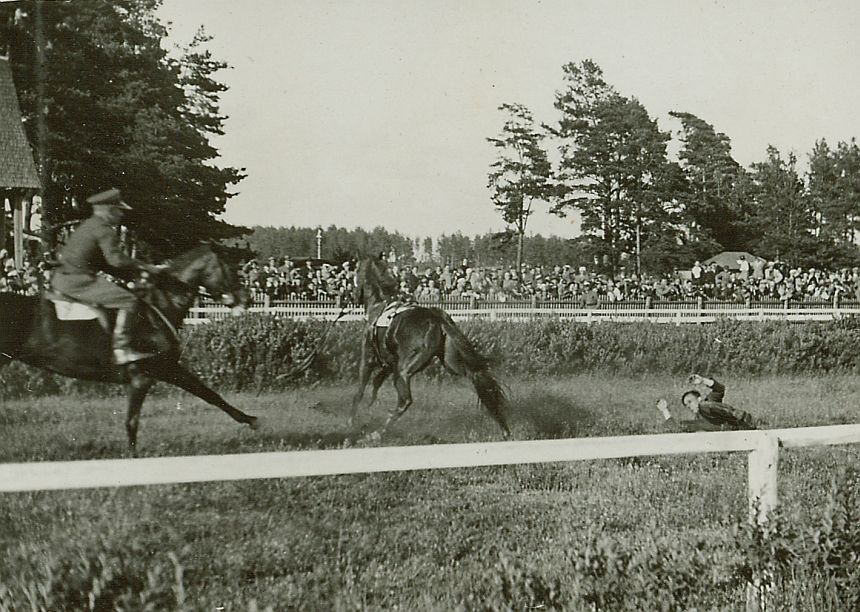 | Nr. inwentarzowy: MŁJ-XVI 1747 / 00 / 066 opis: Tor wyścigów konnych - wojskowa gonitwa z przeszkodami im. 8 Pułku Ułanów Księcia Józefa Poniatowskiego. Po upadku: na bieżni leży por. Adam Jaroszewski, jego koń Pandur Egmont podniósł się i stoi w poprzek toru. W ich stronę galopuje inny oficer.czas powstania - daty graniczne: 1938-06-19 - 1938-06-19miejsce: Wilno, Pośpieszkaosoby: Por. Adam Jaroszewski 2 p.sz.tworzywo: papier fotograficzny, błyszczącytechnika: odbitka żelatynowo-srebrowa DOP, czarno-białazespół: album rodziny Leskichwymiary (wys. x szer.): 59 x 82 [mm] Koń: 1. Pandur Egmont - koń, który startował w gonitwach przeszkodowych w Wilnie, w 1938 roku.
