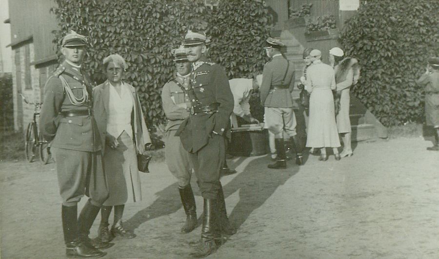 | Nr. inwentarzowy: MŁJ-XVI 1756 / 03 / 030 opis: Tor wyścigów konnych - fragment drewnianej trybuny z prowadzącymi do niej schodami i pnączami. Przed trybuną grupki ludzi, głównie oficerowie i kobiety. Najbliżej widza 4 osoby, od lewej: por. Jarosław Domański, Wanda Bohdanowicz, rtm. Kazimierz Choroszewski i płk Czesław Kozierowski.data: miting wyścigowy w Baranowiczachczas powstania - daty graniczne: 1933-06-25 - 1933-07-06miejsce: Baranowiczeosoby: Por. Jarosław Domański (ur. 1908, 4 p.u., "Sławek"); Wanda Bohdanowicz 1908-1991 (z domu Leska); rtm. Kazimierz Choroszewski ur. 1898 (rtm. 4 p.u. uczestnik zawodów wojskowych wyścigów, później PSZ), płk.Czesław Kozierowski (1890-1940 Charków), do 1932 dow. 4 p.u., potem O.T.O., lubiany, popierał sport i wyścigi).inne nazwy własne: O.T.O. - Oficerski Trybunał Orzekającytworzywo: papier fotograficzny, błyszczącytechnika: odbitka żelatynowo-srebrowa DOP, czarno-białazespół: album rodziny Bohdanowiczówwymiary (wys. x szer.): 67 x 109 [mm]
