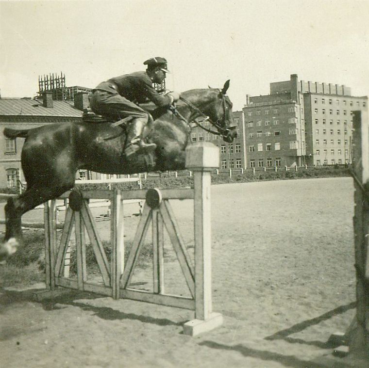| Nr. inwentarzowy: MŁJ-XVI 1753 / 00 / 149 opis: Rtm. Wilhelm Lewicki na koniu Karny w treningowym skoku przez przeszkodę - bramkę. Jeździec w mundurze. Na placu inne przeszkody, w tle starsza i nowa zabudowa.data: maj 1930 r.czas powstania - daty graniczne: 1930-05-01 - 1930-05-31miejsce: Warszawa, ul. Koszykowa 79, Wyższa Szkoła Wojenna, ujeżdżalnia położona w kwartale: Koszykowa – Krzywickiego/Sucha – 6 Sierpnia/Nowowiejska – Topolowa/Al. Niepodległościosoby: Rtm. Wilhelm Rogala-Lewicki 1898-1992 Londyn ("Wil", jeździec klasy międzynarodowej, w 1929 r. reprezentował w konkursach W.S.W. - był w niej głównym instruktorem jazdy konnej).tworzywo: papier fotograficzny, błyszczącytechnika: odbitka żelatynowo-srebrowa DOP, czarno-białazespół: album rodziny Bohdanowiczówwymiary (wys. x szer.): 62 x 62 [mm] Koń: 1. Karny - koń, na którym na przełomie l. 20. i 30. startował w skokach przez przeszkody rtm. Wilhelm Lewicki, m.in. w Warszawie i Gdyni. Później dosiadała go H. Orthweinówna. Karny miał kurtyzowany ogon.