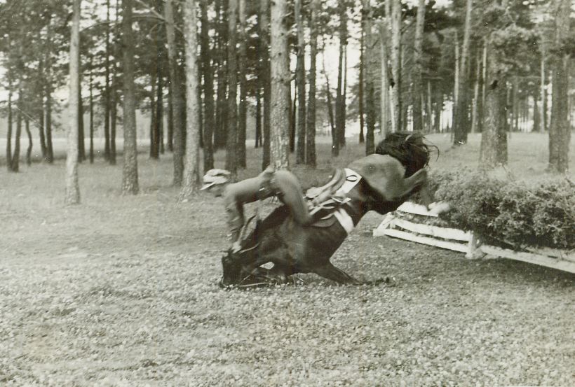 | Nr. inwentarzowy: MŁJ-XVI 1758 / 00 / 089 opis: Okolice toru wyścigów konnych. Groźnie wyglądający upadek konia z jeźdźcem na przeszkodzie. Ppor. Ryszard Cieśliński (w mundurze) wylatuje z siodła, koń Oberek przewraca się przez głowę po skoku przez płot - hyrdę. W tle zagajnik. Koń i jeździec startowali w październiku 1935 r. w zawodach w skokach.czas powstania - daty graniczne: 1935-07-18 - 1935-07-18miejsce: Wilno, Pośpieszkaosoby: Ppor. Ryszard Ciepliński ur. 1910 r. (w opisie zdjęcia w albumie 13 p.u., służył także w 3 p.u. i w Korpusie Ochrony Pogranicza. tworzywo: papier fotograficzny, błyszczącytechnika: odbitka żelatynowo-srebrowa DOP, czarno-białazespół: album rodziny Bohdanowiczówwymiary (wys. x szer.): 85 x 124 [mm] Koń: 1. Oberek - koń, na którym w 1935 r. w Wilnie startował w biegu na przełaj R. Cieśliński.