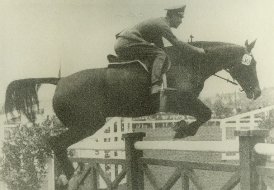 | Nr. inwentarzowy: MŁJ-XVI 1639 / 00 / 023 opis: Niemiec rtm. Marten von Barneckow na koniu Olaf w skoku przez płotek - stacjonatę. Koń w rzędzie sportowym, ogłowie wędzidłowe z numerem 30. W tle szranki, publiczność.czas powstania - daty graniczne: 1929-01-01 - 1939-08-31osoby: Niemiec rtm. Marten von Barenckow [Barnekow]- złoty medalista olimpijski z Berlina 1936 (zespołowo, kl. Nordland)tworzywo: papier fotograficzny, matowytechnika: odbitka żelatynowo-srebrowa z wydrukuzespół: album Clemensa Nagla Międzynarodowi artyści w jeździe przez przeszkodywymiary (wys. x szer.): 125 x 174 [mm] Koń: 1. Olaf