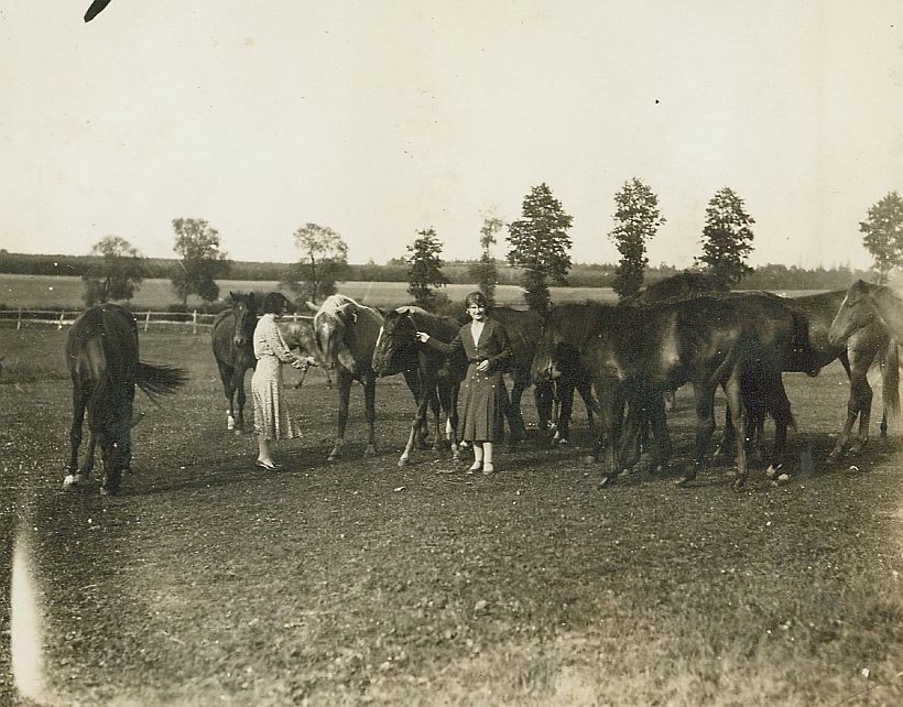 | Nr. inwentarzowy: MŁJ-XVI 1745 / 00 / 004 opis: Stadnina. Około 10 koni stoi na padoku, wśród nich dwie młode kobiety - Irène (w jasnej sukience) i Janina Kotlińska (w ciemnej sukience).data: czerwiecczas powstania - daty graniczne: 1931-06-01 - 1931-06-30miejsce: Parzniewice (łódzkie, majątek Kotlińskich, od 1931 r. Wereszczyńskich)osoby: Irène; Janina Kotlińska 1907-1989 („Nina”, "Ninon", córka Kazimierza i Eugenii zd. Grudzińskiej, siostra Edmunda)tworzywo: papier fotograficzny, błyszczącytechnika: odbitka żelatynowo-srebrowa DOP, czarno-białazespół: album rodziny Leskichwymiary (wys. x szer.): 83 x 105 [mm]
