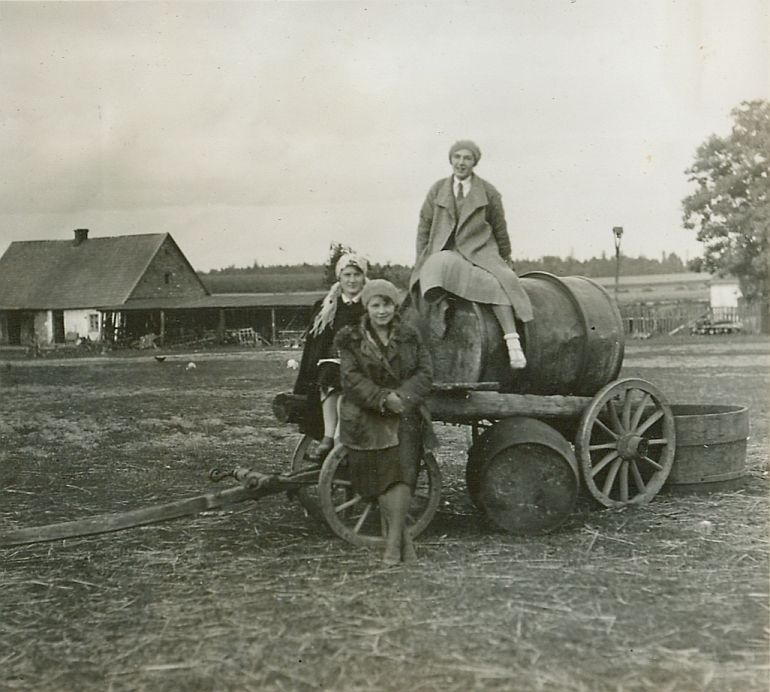 | Nr. inwentarzowy: MŁJ-XVI 1745 / 00 / 024 opis: Na tle zabudowań gospodarczych beczkowóz na drewnianych kołach, z dyszlem. Na beczce siedzi jedna z sióstr Leskich, na platformie beczkowozu i przed nim jeszcze dwie kobiety. Panie w nakryciach głowy, płaszczach, kurtkach.data: sierpieńczas powstania - daty graniczne: 1931-08-01 - 1931-08-31miejsce: Parzniewice (łódzkie, majątek Kotlińskich, od 1931 r. Wereszczyńskich)osoby: Wanda Leska, później Bohdanowicz (1908-1991) lub Anna (Anka) Leska, później Leska-Daab (1910-1998).tworzywo: papier fotograficzny, błyszczącytechnika: odbitka żelatynowo-srebrowa DOP, czarno-białazespół: album rodziny Leskichwymiary (wys. x szer.): 82 x 90 [mm]