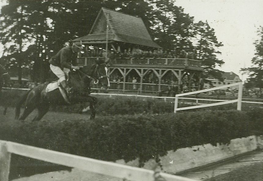 | Nr. inwentarzowy: MŁJ-XVI 1747 / 00 / 053 opis: Tor wyścigów konnych - wojskowa (jeźdźcy w mundurach) gonitwa z przeszkodami im. K.O.P. Rokitno. Wyścig nr 10, Na hyrdzie z rowem kl. Pilica pod. rtm. Michałem Bohdanowiczem. W opisie w albumie: wygrał rtm. Bohdanowicz, a "Przegląd Kawaleryjski" 10/1938 podaje, że zwyciężył rtm. Kalinowski na kl. Bagatela. W tle drewniana trybuna.czas powstania - daty graniczne: 1938-06-16 - 1938-06-16miejsce: Wilno, Pośpieszkaosoby: Rtm. Michał Bohdanowicz (1903-1948), od 1936 w 13 Pułku Ułanów Wileńskich, do 15.05.1938 dowódca 1 szwadronu "Tatarskiego"; rtm. Konstanty Kalinowski (ur. 1898), 10 p.u., po 1934 w Sztabie Naczelnego Wodza, oddział II, walczył w kampanii wrześniowej, potem w PSZ) - na zdjęciu widać tylko łeb Bagateli.tworzywo: papier fotograficzny, błyszczącytechnika: odbitka żelatynowo-srebrowa DOP, czarno-białazespół: album rodziny Leskichwymiary (wys. x szer.): 59 x 84 [mm] Konie: 1. Pilica, klacz - Harlekin - Brama, hod. K. Czermiński, wł. W. Wojtowicz. Koń, na którym rtm. M. Bohdanowicz startował w 1938 r. w gonitwach w Wilnie-Pośpieszce 2. Bagatela, klacz - hod. S. Kierznowski, wł. M.S.Wojsk. Koń, który w 1938 roku startował pod. rtm. Kalinowskim w wyścigach w Wilnie-Pośpieszce