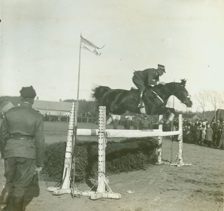 | Nr. inwentarzowy: MŁJ-XVI 1754 / 01 / 004 opis: Konkurs skoków. Por. Michał Bohdanowicz 4 p.u. w skoku na koniu Talar przez przeszkodę - wąski okser poprzedzony hyrdą. Para ta zdobyła I nagrodę. Przy stojakach przeszkody stoją żołnierze. W tle liczna publiczność, fragment budynkudata: rok 1932, prawdopodobnie wiosna lub jesieńczas powstania - daty graniczne: 1932-01-01 - 1932-12-31miejsce: Polska, Wilno lub okolice?, prawdopodobnie jedna z ujeżdżalni, z których korzystał 4 p.u.osoby: Por./rtm. Michał Bohdanowicz 1903–1948, syn Jana Bohdanowicza i Marii „Maryni” z Cywińskich, 9 p.s.k., 4 p.u., 13 p.u.; uczestnik konkursów wojskowych, biegów i wyścigów.tworzywo: papier fotograficzny, błyszczącytechnika: odbitka żelatynowo-srebrowa DOP, czarno-białazespół: album rodziny Bohdanowiczówwymiary (wys. x szer.): 86 x 92 [mm] Koń: 1. Talar III, wałach, maść kasztanowata - hod. Bogumiła Hebanowskiego; ur. przed 1928, prywatny koń Michała Bohdanowicza, który startował na nim w konkursach ujeżdżenia, skoków (np. Mitingi Popularne PZJ 1938-39 i WKKW ("Militari"), biegach myśliwskich, skiringu, uczestniczył w ćwiczeniach wojskowych. Dosiadała go też żona Michała - Wanda (m.in. w 1937 r. w Grudziądzu)..
