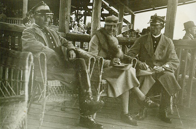 | Nr. inwentarzowy: MŁJ-XVI 1758 / 00 / 017 opis: Tor wyścigów konnych. W loży prezesa (prezes Wileńskiego Towarzystwa .Hodowli i Popierania Sportu Konnego gen. Marian Przewłocki, który codziennie wręczał zwycięzcom nagrody, gdy na torze nie było fundatora) siedzą: rtm. Władysław Zgorzelski, Wanda Bohdanowicz, por. Antoni Żelewski. Mężczyźni w mundurach, płaszczach, kobieta w płaszczu z kołnierzem z lisa i kapeluszu.czas powstania - daty graniczne: 1935-06-30 - 1935-07-21miejsce: Wilno, Pośpieszkaosoby: Rtm. Władysław Zgorzelski 1901-1998 Edynburg (15 p.u., jeździec klasy międzynarodowej, po wojnie trener); Wanda Bohdanowicz zd. Leska (1908-1991), córka Juliusza Leskiego i Marii zd. Olszyńskiej, żona Michała Bohdanowicza; por. Antoni Żelewski 1905-1994 (8 p.u., jeździec klasy międzynarodowej, instruktor).tworzywo: papier fotograficzny, błyszczącytechnika: odbitka żelatynowo-srebrowa DOP, czarno-białazespół: album rodziny Bohdanowiczówwymiary (wys. x szer.): 54 x 80 [mm]