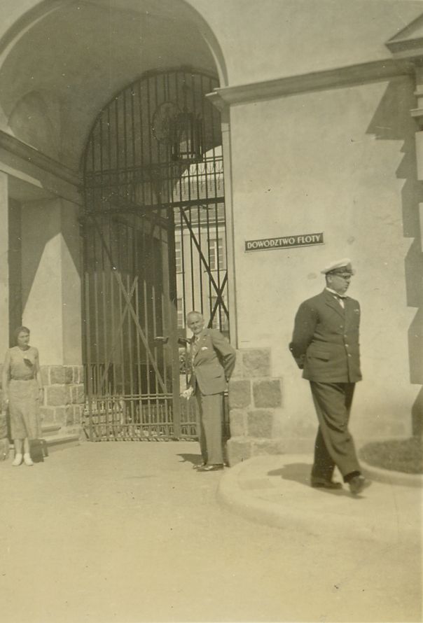 | Nr. inwentarzowy: MŁJ-XVI 1640 / 00 / 039 opis: Sfotografowana "nielegalnie", przez uczestnika rajdu Poznań-Gdynia, brama gmachu Dowództwa Floty. W bramie: K. Dobrogoyska (w sukience) i St. Grabianowski (w jasnym garniturze). Chodnikiem idzie oficer marynarki w mundurze, komandor.data: podano początkową i końcową datę rajduczas powstania - daty graniczne: 1933-08-03 - 1933-08-28miejsce: Gdynia - Oksywie [Oksywja]osoby: Krystyna Dobrogoyska (1902-1975), inż. Stanisław Grabianowski (1889-1957, szef wyprawy), komandor AGinne nazwy własne: budynek Dowództwa Floty, obecny adres: Rondo Bitwy pod Oliwą 1tworzywo: papier fotograficzny, błyszczącytechnika: odbitka żelatynowo-srebrowa DOP, czarno-białazespół: album rodziny Brökerewymiary (wys. x szer.): 91 x 64 [mm]