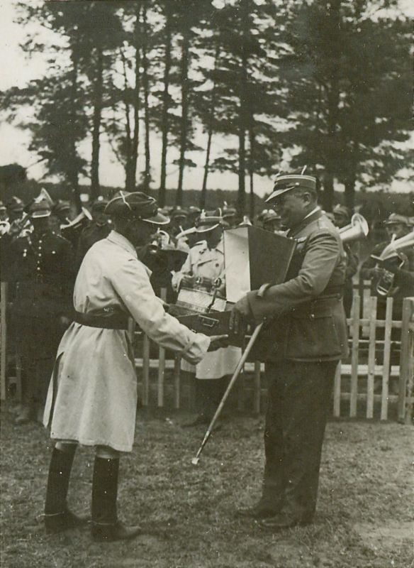 | Nr. inwentarzowy: MŁJ-XVI 1757 / 00 / 044 opis: Tor wyścigów konnych, po wygranej gonitwie z przeszkodami - steeple-chase im. Hetmana Stanisława Żółkiewskiego na dyst. 3600 m. nagrodę odbiera por. Włodzimierz Korytkowski (w jasnym płaszczu). Kryształowe naczynie wręcza płk Władysław Obuch-Woszczatyński (z laską). W tle publiczność i wojskowa orkiestra.czas powstania - daty graniczne: 1934-07-05 - 1934-07-05miejsce: Wilno, Pośpieszkaosoby: Płk Władysław Erazm Obuch-Woszczatyński ur. 1876 r., aresztowany we wrześniu 1939 r. w Białymstoku, zaginiony, inna wersja - rozstrzelany w 1939, Stołpce (twórca i dowódca 10 p.u., w 1934 r. w stanie spoczynku); por. Włodzimierz Korytkowski ur. 1901 (14 p.u., wszechstronny jeździec wyścigowy - właściciel stajni wyścigowej i sportowy klasy międzynarodowej).inne nazwy własne: Woszczatyński-Obuchtworzywo: papier fotograficzny, błyszczącytechnika: odbitka żelatynowo-srebrowa DOP, czarno-białazespół: album rodziny Bohdanowiczówwymiary (wys. x szer.): 79 x 57 [mm]