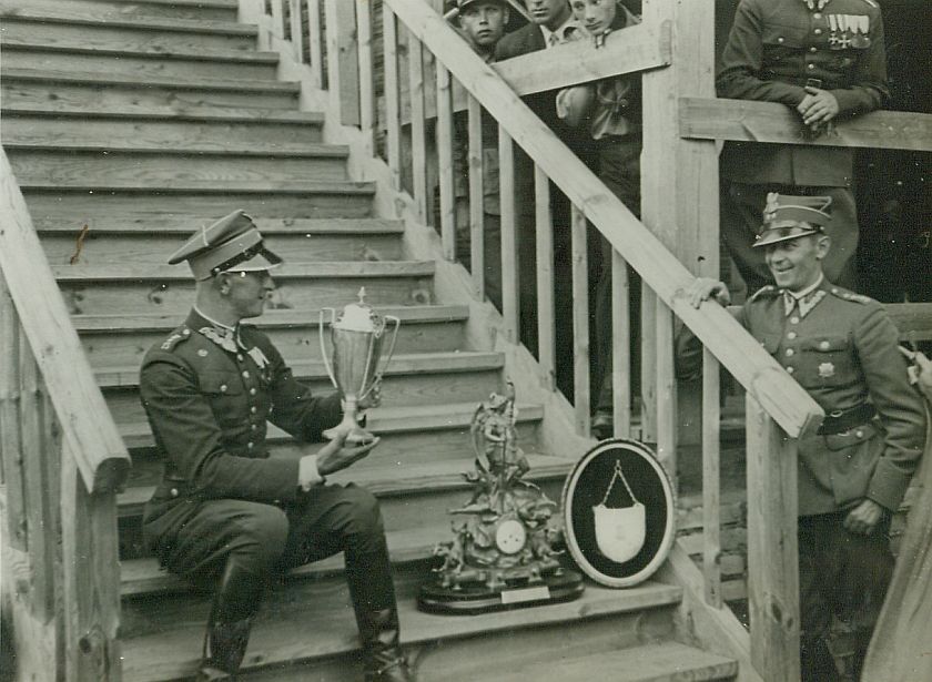 | Nr. inwentarzowy: MŁJ-XVI 1746 / 00 / 076 opis: Tor wyścigów konnych. Na drewnianych schodach siedzi Michał Bohdanowicz. W ręku trzyma puchar za zwycięstwo w steeple-chase im. Gen. Rydza-Śmigłego, obok inne nagrody - rzeźbiony zegar i ryngraf na owalnej tarczy. Przy schodach stoi uśmiechnięty Antoni Żelewski. Obaj oficerowie w mundurach. Za barierką kilka osób.czas powstania - daty graniczne: 1936-07-05 - 1936-07-12miejsce: Wilno, Pośpieszka.osoby: Rtm. Michał Bohdanowicz "Miś" (1903-1948), 13 p.u., dowódca 1 szwadronu "Tatarskiego". Por. Antoni Żelewski (1905-1994), 8 p.u., jeździec klasy międzynarodowej, instruktor.tworzywo: papier fotograficzny, błyszczącytechnika: odbitka żelatynowo-srebrowa DOP, czarno-białazespół: album rodziny Leskichwymiary (wys. x szer.): 84 x 113 [mm]