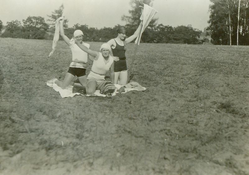 | Nr. inwentarzowy: MŁJ-XVI 1753 / 00 / 045 opis: Na rżysku(?), na kocu klęczą (od lewej): Wanda Leska, Anna Leska i Janina Kotlińska. Kobiety w strojach do opalania, każda ma w uniesionej ręce kawałek jasnego materiału (Janina na szczotce). W tle krzewy, drzewa.data: sierpień 1929 r.czas powstania - daty graniczne: 1929-08-01 - 1929-08-31miejsce: Parzniewice (łódzkie, majątek Kotlińskich, od 1931 r. Wereszczyńskich)osoby: Wanda Leska 1908-1991 (od 1932 r. Bohdanowicz); Anna Leska 1910-1998 ("Anka", później Leska-Daab, podczas II wojny światowej pilot w Wielkiej Brytanii); Janina Kotlińska 1907-1989 („Nina”, "Ninon", córka Kazimierza i Eugenii zd. Grudzińskiej, siostra Edmunda)tworzywo: papier fotograficzny, błyszczącytechnika: odbitka żelatynowo-srebrowa DOP, czarno-białazespół: album rodziny Bohdanowiczówwymiary (wys. x szer.): 84 x 115 [mm]