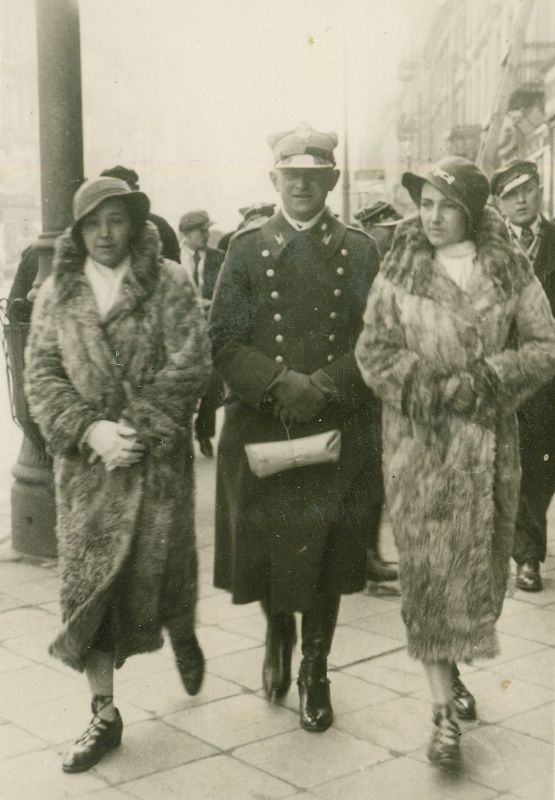 | Nr. inwentarzowy: MŁJ-XVI 1757 / 00 / 010 opis: Warszawską ulicą idą od lewej: Wanda Bohdanowicz, por. Michał Bohdanowicz, Anna Leska. Kobiety w kapeluszach i futrach, porucznik w mundurze, niesie zawiniątko.data: kwiecień 1934 r.czas powstania - daty graniczne: 1934-04-01 - 1934-04-30miejsce: Warszawaosoby: Wanda Bohdanowicz zd. Leska 1908-1991 (córka Juliusza Leskiego i Marii zd. Olszyńskiej, żona Michała Bohdanowicza, siostra Anny); por. Michał Bohdanowicz 1903-48 (syn Jana Bohdanowicza i Marii z Cywińskich. W latach 1932-36 i przed II wojną w 4 Pułku Ułanów Zaniemeńskich, nazywany "Misiem", mąż Wandy zd. Leskiej); Anna Leska 1910-1998 ("Anka", siostra Wandy, później Leska-Daab, podczas II wojny światowej pilot w Wielkiej Brytanii).tworzywo: papier fotograficzny, błyszczącytechnika: odbitka żelatynowo-srebrowa DOP, czarno-białazespół: album rodziny Bohdanowiczówwymiary (wys. x szer.): 81 x 58 [mm]