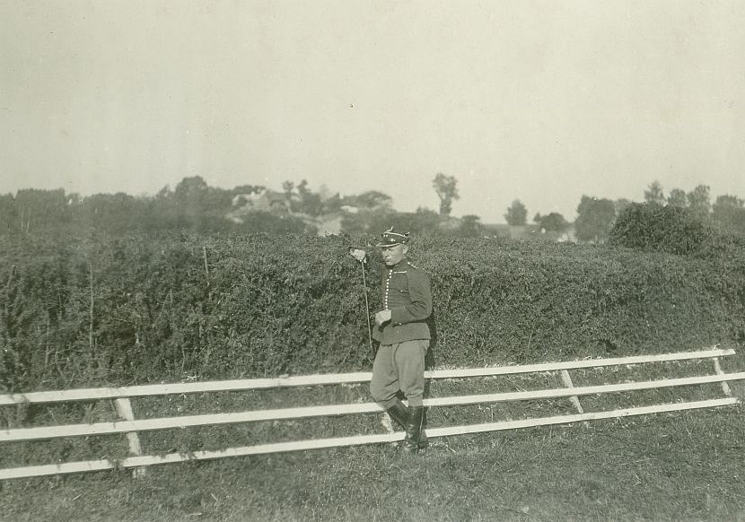 | Nr. inwentarzowy: MŁJ-XVI 1753 / 00 / 001 opis: Tor wyścigów konnych. Na tle wyścigowej przeszkody - wysokiego żywopłotu - stoi kawalerzysta w mundurze - por. Jerzy Strużyński. W ręku trzyma palcat - prawdopodobnie przed lub po treningu.