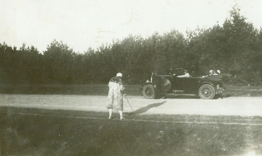| Nr. inwentarzowy: MŁJ-XVI 1753 / 00 / 080 opis: Wycieczka samochodowa do Garwolina, piaszczysta droga przez sosnowy zagajnik. W samochodzie osobowym: za kierownicą rtm. Wilhelm Lewicki, na tylnym siedzeniu: Maria Leska (wychyla się), Wanda Leska (widać ty;ko jasny beret), mężczyzna. Przy kole zapasowym stoi mężczyzna w ciemnym ubraniu. Na pierwszym planie Anna Leska (tyłem, z aparatem fotograficznym na statywie)data: październik 1929 r.czas powstania - daty graniczne: 1929-10-01 - 1929-10-31miejsce: droga do Garwolinaosoby: Rtm. Wilhelm Rogala-Lewicki 1898-1992 Londyn ("Wil", jeździec klasy międzynarodowej, w 1929 r. reprezentował w konkursach W.S.W. - był w niej głównym instruktorem jazdy konnej); Maria Leska 1886-1949 (matka Wandy, Anny i Kazimierza), Wanda Leska 1908-1991 (później Bohdanowicz); Anna Leska 1910-1998 ("Anka", później Leska-Daab, podczas II wojny światowej pilot w Wielkiej Brytanii)tworzywo: papier fotograficzny, błyszczącytechnika: odbitka żelatynowo-srebrowa DOP, czarno-białazespół: album rodziny Bohdanowiczówwymiary (wys. x szer.): 67 x 107 [mm]