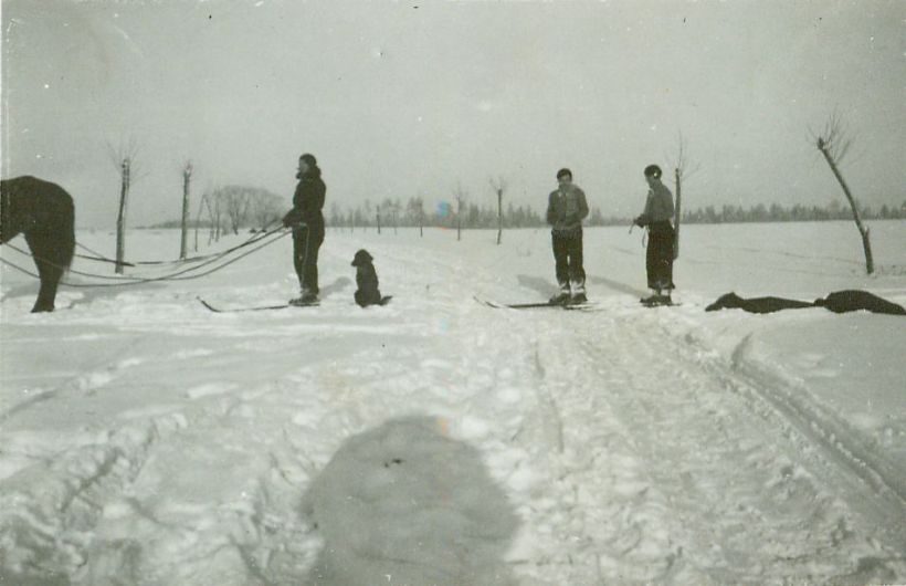 | Nr. inwentarzowy: MŁJ-XVI 1757 / 00 / 005 opis: Od lewej: Krystyna Bohdanowiczówna, Wanda Bohdanowicz, Helena Bohdanowicz na nartach (skiring) - pozują do zdjęcia na zaśnieżonym skrzyżowaniu dróg (na środku aleja obsadzona po obu stronach młodymi drzewami). Z lewej koń w uprzęży szorowej (widać zad), Krystyna trzyma w rękach uchwyt i lejce. Kobietom towarzyszy pies (Dżena?) i jeszcze jedna osoba (widać cień osoby fotografującej). Z prawej na śniegu kurtki lub/i derka.data: styczeń 1934 r.czas powstania - daty graniczne: 1934-01-01 - 1934-01-31miejsce: Stajki - majątek Bohdanowiczów, obecnie wieś na Białorusi w rejonie wilejskim, obwodu mińskiegoosoby: Krystyna Bohdanowiczówna ("Krysia" - córka Jana Bohdanowicza i Marii z Cywińskich, siostra Michała i Krystyny Bohdanowiczów); Wanda Bohdanowicz 1908-1991 (do 1932 Leska, córka Juliusza Leskiego i Marii z d. Olszyńskiej, żona Michała Bohdanowicza); Helena Bohdanowiczówna ur. 1899 r. ("Hela" - córka Jana Bohdanowicza i Marii z Cywińskich, siostra Michała i Krystyny Bohdanowiczów).tworzywo: papier fotograficzny, błyszczącytechnika: odbitka żelatynowo-srebrowa DOP, czarno-białazespół: album rodziny Bohdanowiczówwymiary (wys. x szer.): 55 x 82 [mm]