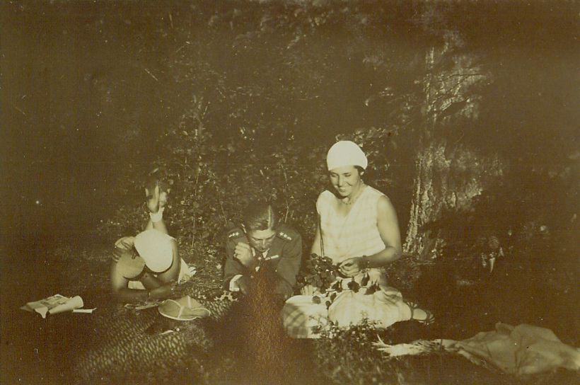 | Nr. inwentarzowy: MŁJ-XVI 1753 / 00 / 040 opis: W "chłopskim lesie" (określenie z opisu w albumie) na kocu (od lewej): Anna Leska (leży), por. Michał Bohdanowicz (leży), Wanda Leska (siedzi). Przed nimi różne przedmioty - książka lub czasopismo, rogatywka, chustka.data: sierpień 1929 r.czas powstania - daty graniczne: 1929-08-01 - 1929-08-31miejsce: Parzniewice (łódzkie, majątek Kotlińskich, od 1931 r. Wereszczyńskich)osoby: Anna Leska 1910-1998 ("Anka", później Leska-Daab, podczas II wojny światowej pilot w Wielkiej Brytanii); por. Michał Bohdanowicz 1903-48 (syn Jana Bohdanowicza i Marii z Cywińskich; do 1932 r. 9 p.s.k., nazywany "Misiem"); Wanda Leska 1908-1991 (od 1932 r. Bohdanowicz)tworzywo: papier fotograficzny, półbłyszczącytechnika: odbitka żelatynowo-srebrowa DOP, sepiowanazespół: album rodziny Bohdanowiczówwymiary (wys. x szer.): 60 x 87 [mm]