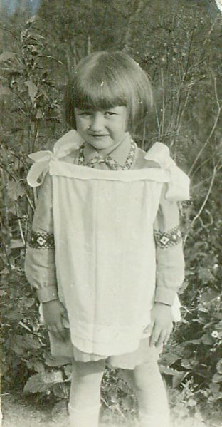 Lili - na tle zieleni stoi kilkuletnia dziewczynka w sukience i fartuszku.