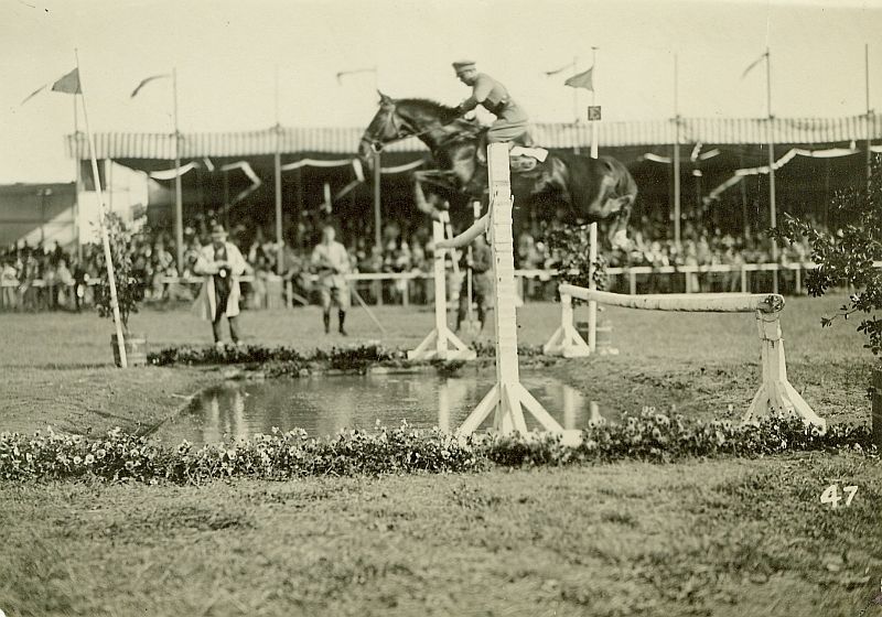 | Nr. inwentarzowy: MŁJ-XVI 1751 / 00 / 004 opis: Międzynarodowe Wojskowe Konkursy Hipiczne, zawodnik belgijski Luis Ivens Ferraz w skoku przez double-barre na rowie z wodą.czas powstania - daty graniczne: 1931-04-14 - 1931-04-27miejsce: Niceaosoby: Portugalczyk por. Luís da Costa Ivens Ferraz 1897-1987, oficer, jeździec klasy międzynarodowej, olimpijczyk z Amsterdamu 1928.tworzywo: papier fotograficzny, półbłyszczącytechnika: odbitka żelatynowo-srebrowa DOP, czarno-białazaklad: MONDIAL PHOTO, NICEzespół: album rodziny Bohdanowiczówwymiary (wys. x szer.): 112 x 158 [mm]