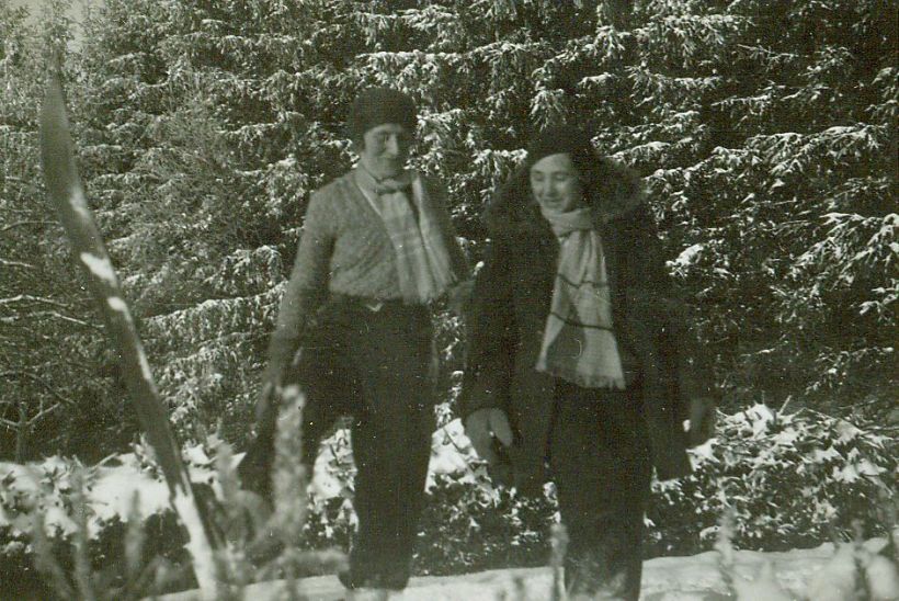 | Nr. inwentarzowy: MŁJ-XVI 1757 / 00 / 001 opis: Helena Bohdanowiczówna (z lewej) i Wanda Bohdanowicz na nartach - pozują do zdjęcia na tle zaśnieżonych iglaków.data: styczeń 1934 r.czas powstania - daty graniczne: 1934-01-01 - 1934-01-31miejsce: Stajki - majątek Bohdanowiczów, obecnie wieś na Białorusi w rejonie wilejskim, obwodu mińskiegoosoby: Helena Bohdanowiczówna ur. 1899 r. ("Hela" - córka Jana Bohdanowicza i Marii z Cywińskich, siostra Michała i Krystyny Bohdanowiczów); Wanda Bohdanowicz 1908-1991 (do 1932 Leska, córka Juliusza Leskiego i Marii z d. Olszyńskiej, żona Michała Bohdanowicza).tworzywo: papier fotograficzny, błyszczącytechnika: odbitka żelatynowo-srebrowa DOP, czarno-białazespół: album rodziny Bohdanowiczówwymiary (wys. x szer.): 58 x 88 [mm]