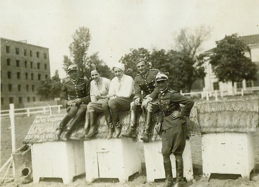 | Nr. inwentarzowy: MŁJ-XVI 1754 / 02 / 009 opis: Plac w mieście (wokół ogrodzenia, dalej budynki). Na i przy elementach przeszkód ("ule"), od lewej: rtm. Józef Najnert, Wanda Leska, Anna Leska [Bohdanowicz], por. Roman Pohorecki, por. Kazimierz Karski (stoi).data: maj 1932 r.czas powstania - daty graniczne: 1932-05-01 - 1932-05-31miejsce: Warszawa, ujeżdżalnia Szwadronu Sztabowegoosoby: Oficerowie: rtm. Józef Najnert 1895-1940 Charków (3 p.u., wybitny jeździec, instruktor); por. Roman Pohorecki ur. 1903 (14 p.u., wybitny zawodnik okresu przed II wojną światową, instruktor); por Kazimierz Karski ur. 1899 (24 p.u., szwadron sztabowy, 1 p.s.k.); amazonki z Klubu Sportowego Rodziny Wojskowej: Wanda Leska 1908-1991 (od 1932 r. Bohdanowicz); Anna Leska 1910-1998 ("Anka", później Leska-Daab, pilot w Wlk. Bryt.).tworzywo: papier fotograficzny, błyszczącytechnika: odbitka żelatynowo-srebrowa DOP, czarno-białazespół: album rodziny Bohdanowiczówwymiary (wys. x szer.): 88 x 117 [mm]
