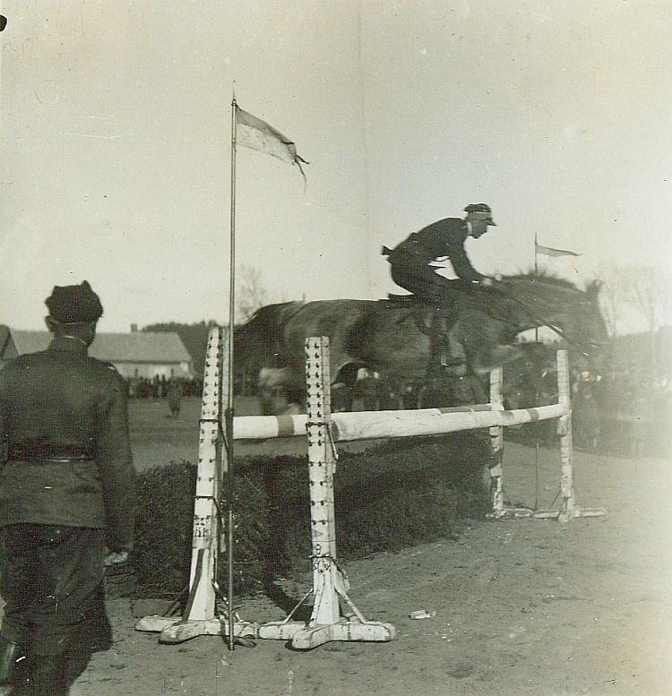 | Nr. inwentarzowy: MŁJ-XVI 1754 / 01 / 006 opis: Konkurs skoków. Por. Henryk Witkowski 4 p.u. w skoku na koniu Tamerlan przez przeszkodę - wąski okser poprzedzony hyrdą. Przy przeszkodzie stoi żołnierz, w tle liczna publiczność, zabudowania.data: rok 1932, prawdopodobnie wiosna lub jesieńczas powstania - daty graniczne: 1932-01-01 - 1932-12-31miejsce: Polska, Wilno lub okolice?, prawdopodobnie jedna z ujeżdżalni, z których korzystał 4 p.u.osoby: Por. Henryk Józef Witkowski ur. 1908; 4 p.u.tworzywo: papier fotograficzny, błyszczącytechnika: odbitka żelatynowo-srebrowa DOP, czarno-białazespół: album rodziny Bohdanowiczówwymiary (wys. x szer.): 87 x 85 [mm] Koń: 1. Tamerlan - koń, na którym w 1932 r. w konkursie skoków startował por. H. Witkowski