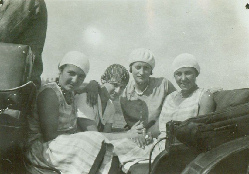 | Nr. inwentarzowy: MŁJ-XVI 1753 / 00 / 064 opis: W drodze do Sobakowa - cztery kobiety w powozie - siedzenie tyłem do kierunku jazdy, w głębi Janina Kotlińska, bliżej Anna Leska; siedzenie przodem do kierunku jazdy, w głębi Barbara M., bliżej Wanda Leska. Kobiety w jasnych, letnich strojach - sukienkach i czapeczkach.data: sierpień 1929 r.czas powstania - daty graniczne: 1929-08-01 - 1929-08-31miejsce: droga między Parzniewicami a Sobakowem (łódzkie)osoby: Janina Kotlińska 1907-1989 („Nina”, "Ninon", córka Kazimierza i Eugenii zd. Grudzińskiej, siostra Edmunda); Anna Leska 1910-1998 ("Anka", później Leska-Daab, podczas II wojny światowej pilot w Wielkiej Brytanii); Barbara M. ("Basia" [Madalińska?, Makólska?]); Wanda Leska 1908-1991 (od 1932 r. Bohdanowicz)tworzywo: papier fotograficzny, błyszczącytechnika: odbitka żelatynowo-srebrowa DOP, czarno-białazespół: album rodziny Bohdanowiczówwymiary (wys. x szer.): 61 x 85 [mm]