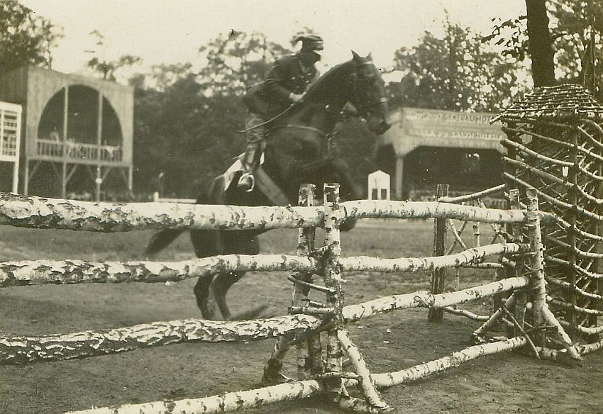 | Nr. inwentarzowy: MŁJ-XVI 1752 / 01 / 005 opis: Międzynarodowe Zawody Konne. Mieczysław Kowalewski w skoku przez stacjonatę z brzozowych drągów na koniu Maraton. W tle charakterystyczne zabudowania warszawskiego hipodromu, na dachu trybuny reklama General Motors.czas powstania - daty graniczne: 1929-06-07 - 1929-06-07miejsce: Polska, Warszawa, Łazienki Królewskieosoby: Mieczysław Kowalewski ur. 1900; por. 20 p.u. (starszeństwo 1.08.1924). Podczas pierwszych Mistrzostw WP Militari w Warszawie zespół 20 p.u. z ppor. Mieczysławem Kowalewskim (kl. Rywalka) zdobył tytuł II wicemistrzów.tworzywo: papier fotograficzny, błyszczącytechnika: odbitka żelatynowo-srebrowa DOP, czarno-białazespół: album rodziny Bohdanowiczówwymiary (wys. x szer.): 61 x 85 [mm] Koń: 1. Maraton - koń, na którym por. M. Kowalewski startował podczas międzynarodowych konkursów w Warszawie w 1929.
