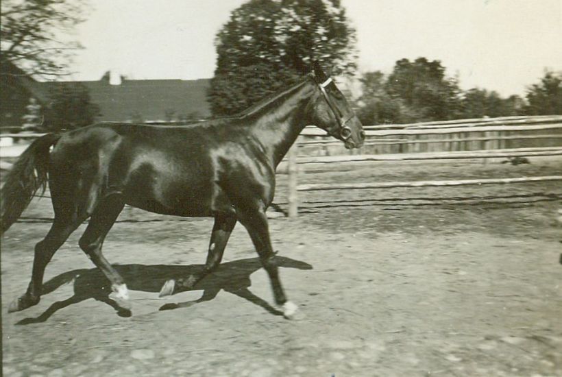 | Nr. inwentarzowy: MŁJ-XVI 1753 / 00 / 067 opis: Koń Narus na okólniku w majątku Felixa Wünsche - ojca Konrada Wünsche, właściciela konia. Narus kłusuje w ogłowiu z polskim nachrapnikiem, bez wodzy.data: wrzesień 1929 r.czas powstania - daty graniczne: 1929-09-01 - 1929-09-30miejsce: Wroników (łódzkie), majątek rodziny Wünsche)osoby: Niewidoczny: Konrad Wünsche 1907-1945 (polski właściciel ziemski niemieckiego pochodzenia, administrator, później właściciel majątku w Opatówku, właściciel majątku Winiary; polski oficer, podczas II wojny w konspiracji - rozstrzelany przez hitlerowców)tworzywo: papier fotograficzny, błyszczącytechnika: odbitka żelatynowo-srebrowa DOP, czarno-białazespół: album rodziny Bohdanowiczówwymiary (wys. x szer.): 61 x 87 [mm] Koń: 1. Narus - koń należący w 1929 r. do Konrada Wünsche