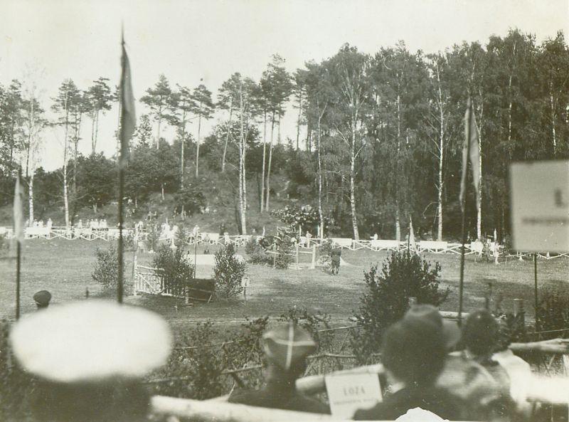 | Nr. inwentarzowy: MŁJ-XVI 1753 / 00 / 022 opis: Letnie konkursy hipiczne. Widok od strony loży (jeden z kibiców trzyma program? z napisem "Loża"). Widać dużą część parkuru i pagórek obok polanydata: zawody rozpoczęto 21 lipcaczas powstania - daty graniczne: 1929-07-21 - 1929-07-31miejsce: Gdynia, Polana Redłowskainne nazwy własne: Polanka Redłowskatworzywo: papier fotograficzny, błyszczącytechnika: odbitka żelatynowo-srebrowa DOP, czarno-białazespół: album rodziny Bohdanowiczówwymiary (wys. x szer.): 87 x 115 [mm]