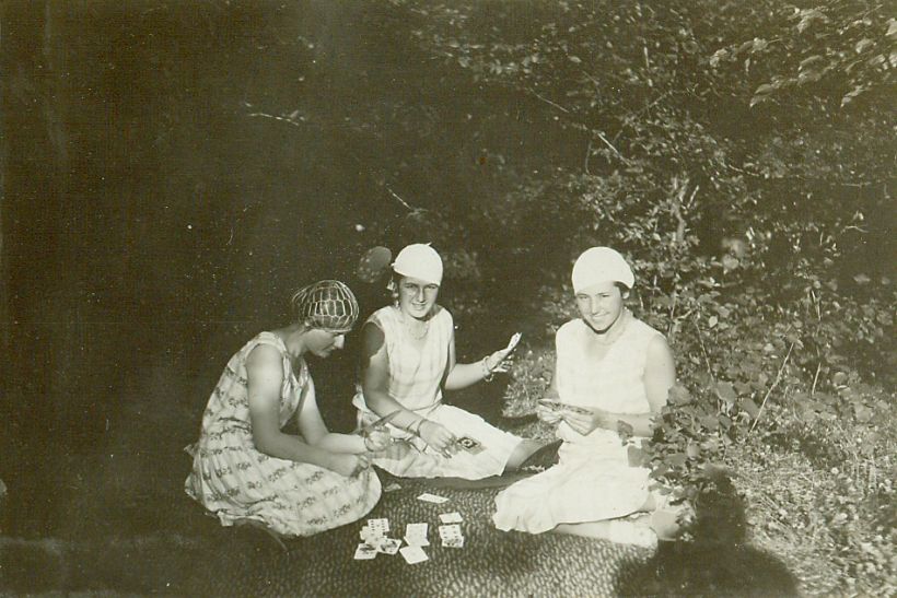 | Nr. inwentarzowy: MŁJ-XVI 1753 / 00 / 039 opis: W lesie lub ogrodzie, na kocu w brydża grają (od lewej): Janina Kotlińska, Anna Leska i Wanda Leska. Widać cień czwartego gracza i/lub fotografa.data: sierpień 1929 r.czas powstania - daty graniczne: 1929-08-01 - 1929-08-31miejsce: Parzniewice (łódzkie, majątek Kotlińskich, od 1931 r. Wereszczyńskich)osoby: Janina Kotlińska 1907-1989 („Nina”, "Ninon", córka Kazimierza i Eugenii zd. Grudzińskiej, siostra Edmunda); Anna Leska 1910-1998 ("Anka", później Leska-Daab, podczas II wojny światowej pilot w Wielkiej Brytanii); Wanda Leska 1908-1991 (od 1932 r. Bohdanowicz)tworzywo: papier fotograficzny, błyszczącytechnika: odbitka żelatynowo-srebrowa DOP, czarno-białazespół: album rodziny Bohdanowiczówwymiary (wys. x szer.): 61 x 88 [mm]