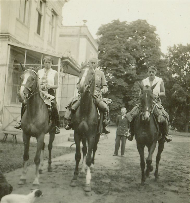| Nr. inwentarzowy: MŁJ-XVI 1640 / 00 / 020 opis: Rajd Poznań-Gdynia, zorganizowany przez Śląski Klub Jazdy Konnej. Sprzed pałacu w Wysokiej odjeżdżają konno uczestnicy rajdu: R. Brökere, K. Dobrogoyska i St. Grabianowski. Zza koni widać mężczyznę w garniturze (dwurzędowa marynarka, muszka), z przodu psy. Do siodeł stroczone juki.data: podano początkową i końcową datę rajduczas powstania - daty graniczne: 1933-08-03 - 1933-08-28miejsce: Wysoka k. Tucholi, pałac Janta-Połczyńskichosoby: Romana (Roma) Brökere (1909-2001, później Daszkowska), inż. Stanisław Grabianowski (1889-1957, szef wyprawy), Krystyna Dobrogoyska (1902-1975)tworzywo: papier fotograficzny, błyszczącytechnika: odbitka żelatynowo-srebrowa DOP, czarno-białazespół: album rodziny Brökerewymiary (wys. x szer.): 65 x 61 [mm]