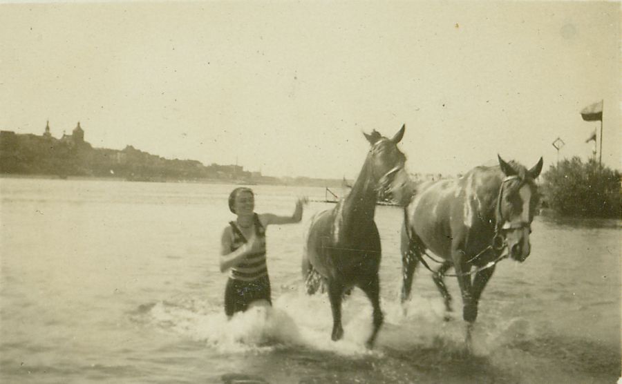 opis: Rajd Poznań-Gdynia, zorg. przez Śląski Klub Jazdy Konnej - pławienie koni w Wiśle. Szeroko rozlana rzeka, w tle dalszy brzeg, na bliższym biało-czerwone flagi i znak żeglugowy (przebieg szlaku żeglownego blisko lewego brzegu). Z wody wychodzą dwa konie w ogłowiach i K. Dobrogoyska w pasiastym stroju kąpielowym i berecie.
