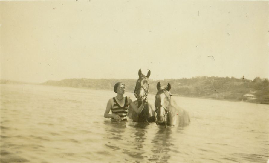 opis: Rajd Poznań-Gdynia, zorganizowany przez Śląski Klub Jazdy Konnej - pławienie koni w Wiśle. Szeroko rozlana rzeka, w tle dalszy brzeg. W wodzie, do połowy zanurzone stoją dwa konie w ogłowiach i K. Dobrogoyska w pasiastym stroju kąpielowym i berecie.