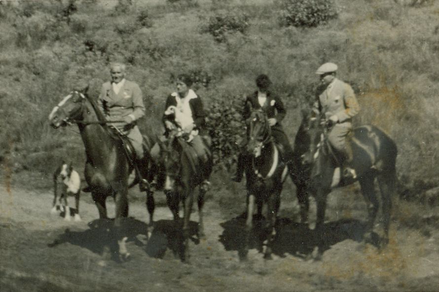 | Nr. inwentarzowy: MŁJ-XVI 1640 / 00 / 034 opis: Rajd Poznań-Gdynia, zorganizowany przez Śląski Klub Jazdy Konnej. Na drodze, na tle krzewów siedzą na stojących koniach: St. Grabianowski, K. Dobrogoyska (trzyma na siodle małego pieska), kobieta w eleganckim stroju jeździeckim, mężczyzna w jasnej marynarce i kaszkiecie.data: podano początkową i końcową datę rajduczas powstania - daty graniczne: 1933-08-03 - 1933-08-28miejsce: Gdyniaosoby: inż. Stanisław Grabianowski (1889-1957, szef wyprawy), Krystyna Dobrogoyska (1902-1975)tworzywo: papier fotograficzny, błyszczącytechnika: odbitka żelatynowo-srebrowa DOP, czarno-białazespół: album rodziny Brökerewymiary (wys. x szer.): 61 x 87 [mm]