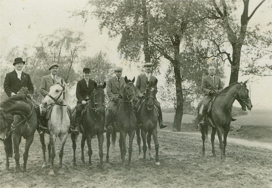 | Nr. inwentarzowy: MŁJ-XVI 1629 / 00 / 047 opis: W szeregu, na koniach: kobieta i mężczyźni w jeździeckich strojach spacerowych. Jeden z mężczyzn i kobieta w ciemnych frakach, pozostali w tweedowych marynarkach i kaszkietach, jeden z gołą głową. Konie ciemnej maści i siwek. Rzędy sportowe, ogłowia z nachrapnikami. Obok droga wysadzana drzewami. czas powstania - daty graniczne: 1936-03-01 - 1939-08-31miejsce: okolice Hrubieszowa(?)tworzywo: papier fotograficzny, błyszczącytechnika: odbitka żelatynowo-srebrowa DOP, czarno-białazespół: album rodziny Grotthuswymiary (wys. x szer.): 58 x 83 [mm]