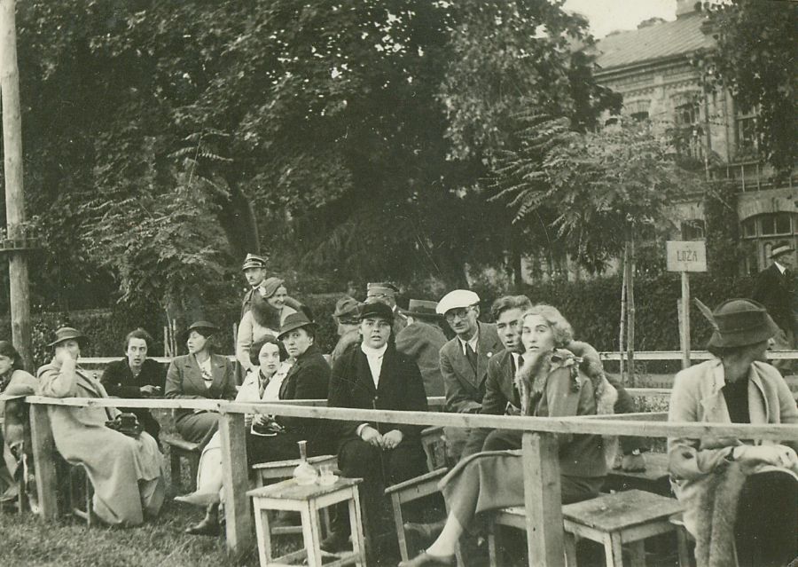 | Nr. inwentarzowy: MŁJ-XVI 1628 / 00 / 029 opis: Tabliczka z napisem "loża" sugeruje honorowe miejsce dla publiczności. Na taboretach siedzi oraz w głębi stoi ok. 10 pań (jedna w stroju jeździeckim), nieliczni oficerowie i cywile, w tym Henryk Mackiewicz (jasna czapka). W tle budynek, drzewa.data: prawdopodobnie 1937 r.czas powstania - daty graniczne: 1937-04-01 - 1937-11-30miejsce: Hrubieszówosoby: Henryk Mackiewiczinne nazwy własne: Hrubieszowski Klub Jeździecki, 2 Pułk Strzelców Konnych - organizatorzy imprez jeździeckichtworzywo: papier fotograficzny, błyszczącytechnika: odbitka żelatynowo-srebrowa DOP, czarno-białazespół: album rodziny Grotthuswymiary (wys. x szer.): 65 x 89 [mm]