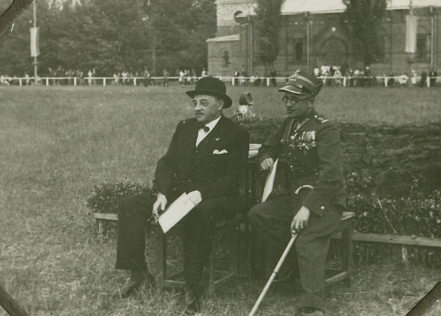 | Nr. inwentarzowy: MŁJ-XVI 1629 / 00 / 030 opis: Prawdopodobnie komisja sędziowska zawodów w skokach. Trawiasty placu ze szrankami, przy których stoi publiczność, z tyłu drzewa, budynek. Na ławce na środku siedzą cywil w czarnym garniturze, muszce i meloniku oraz rotmistrz w mundurze z odznaczeniami, w okularach z laską, obaj mają w rękach papier i ołówek.czas powstania - daty graniczne: 1938-03-01 - 1939-08-31miejsce: Hrubieszówtworzywo: papier fotograficzny, błyszczącytechnika: odbitka żelatynowo-srebrowa DOP, czarno-białazespół: album rodziny Grotthuswymiary (wys. x szer.): 60 x 81 [mm]