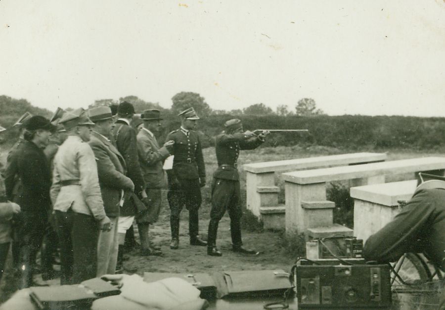 | Nr. inwentarzowy: MŁJ-XVI 1628 / 00 / 059 opis: Zawody strzeleckie o nagrodę Hołubia zorganizowane przez HKJ. Strzelnica, stanowiska z jasnego materiału - betonu(?), w prawym dolnym rogu żołnierz z rowerem i polowym urządzeniem (telefon, radiostacja?) Strzela wojskowy, za nim kilkanaście osób: kobieta, cywile i żołnierze. W głębi nasyp - kulochwyt.czas powstania - daty graniczne: 1936-11-18 - 1936-11-20miejsce: Hrubieszów lub okoliceosoby: nagrody honorowe i pieniężne ufundowali pp. Świeżawscy (właściciele Hołubia [Gołębia]), gospodarzem toru był rtm. Stanisław Glasser (członek komisji technicznej HKJ)inne nazwy własne: Hrubieszowski Klub Jeździecki, 2 Pułk Strzelców Konnych - organizatorzy imprez jeździeckichtworzywo: papier fotograficzny, błyszczącytechnika: odbitka żelatynowo-srebrowa DOP, czarno-białazespół: album rodziny Grotthuswymiary (wys. x szer.): 64 x 88 [mm]