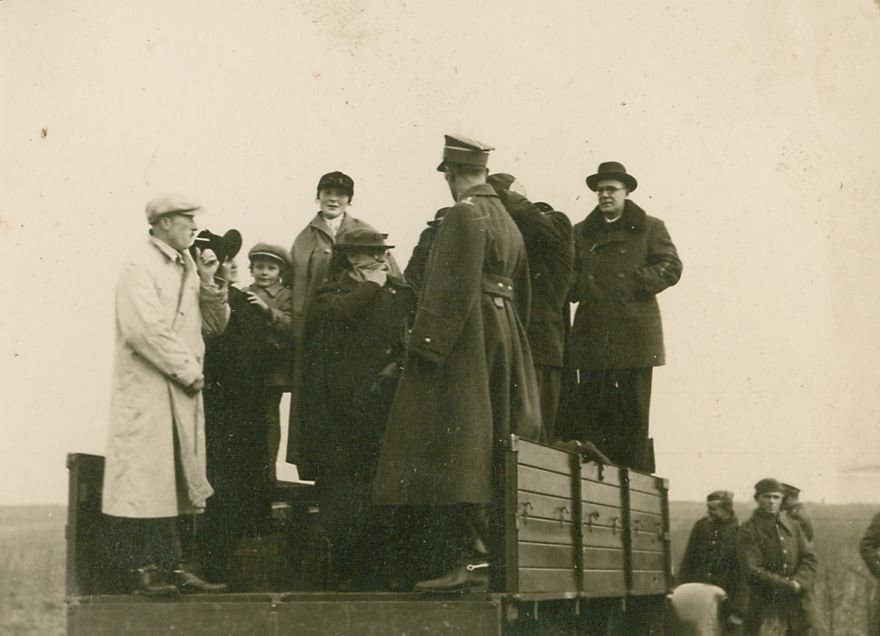 | Nr. inwentarzowy: MŁJ-XVI 1629 / 00 / 009 opis: Na łące stoi ustawiona tyłem ciężarówka. Na otwartej z tyłu "pace" stoją kibice: cywil w jasnym płaszczu i kaszkiecie, kobieta z dzieckiem, młoda kobieta, starsza pani, oficer i cywil w ciemnym płaszczu, okularach i kapeluszu. Na ziemi stoi kilku wojskowych.czas powstania - daty graniczne: 1938-01-01 - 1938-12-31miejsce: okolice Hrubieszowatworzywo: papier fotograficzny, błyszczącytechnika: odbitka żelatynowo-srebrowa DOP, czarno-białazespół: album rodziny Grotthuswymiary (wys. x szer.): 65 x 87 [mm]