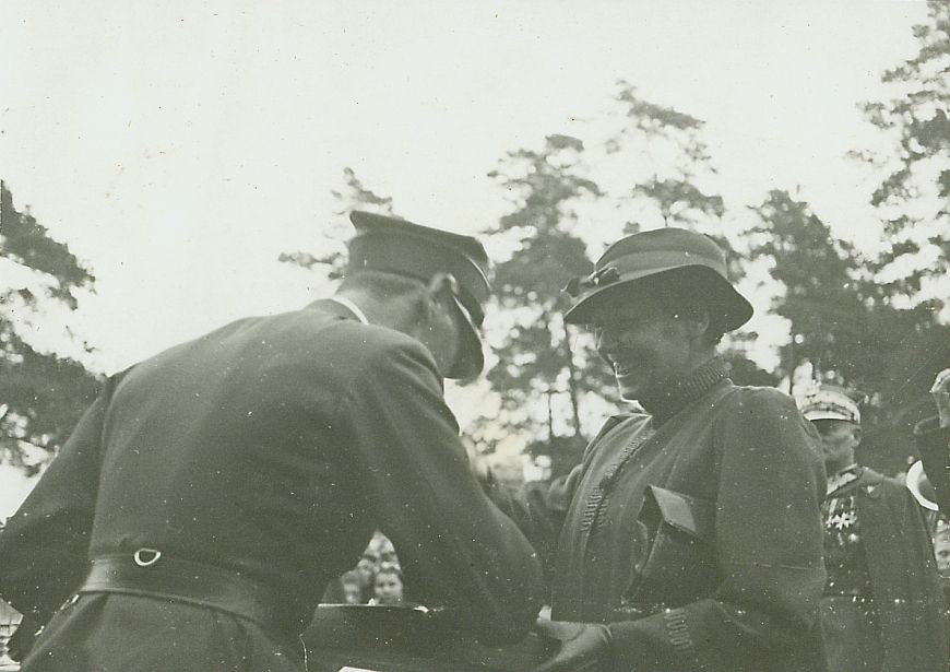 | Nr. inwentarzowy: MŁJ-XVI 1747 / 00 / 089 opis: Tor wyścigów konnych - po wygranej gonitwie lub biegu. Wanda Bohdanowicz wręcza por. Antoniemu Żelewskiemu nagrodę Obodowiec (majątek Mieczysława Bohdanowicza, obecnie obw. miński, pow. wilejski na Białorusi).czas powstania - daty graniczne: 1938-06-23 - 1938-06-23miejsce: Wilno, Pośpieszkaosoby: Wanda Bohdanowicz zd. Leska (1908-1991), córka Juliusza Leskiego i Marii zd. Olszyńskiej, żona Michała Bohdanowicza; por. Antoni Żelewski (1905-1994), 8 p.u., jeździec klasy międzynarodowej, instruktor.tworzywo: papier fotograficzny, błyszczącytechnika: odbitka żelatynowo-srebrowa DOP, czarno-białazespół: album rodziny Leskichwymiary (wys. x szer.): 58 x 82 [mm]
