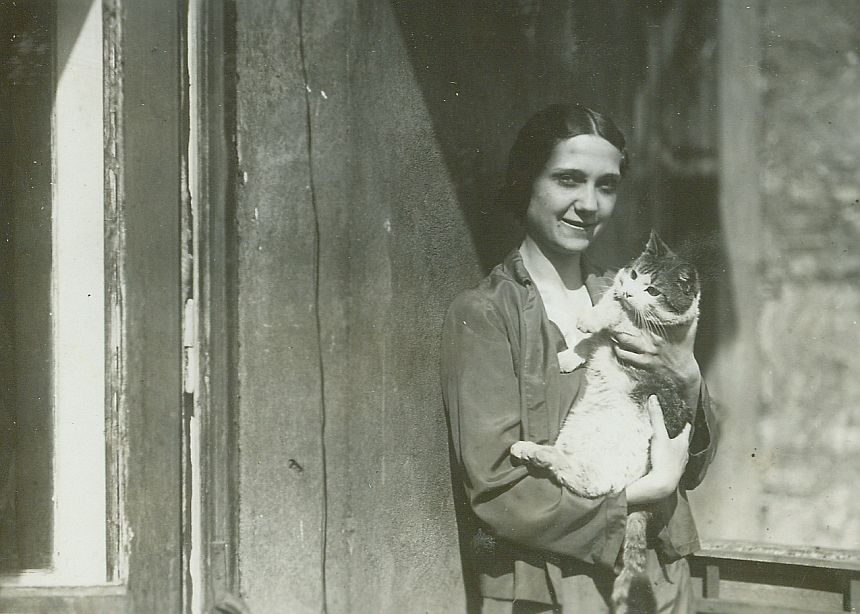 Kobieta z kotem przy wejściu do domu - Zofia Olędzka z Kiciem.